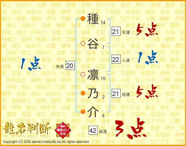 種(14画)谷(7画) 凛(15画)乃(2画)介(4画)