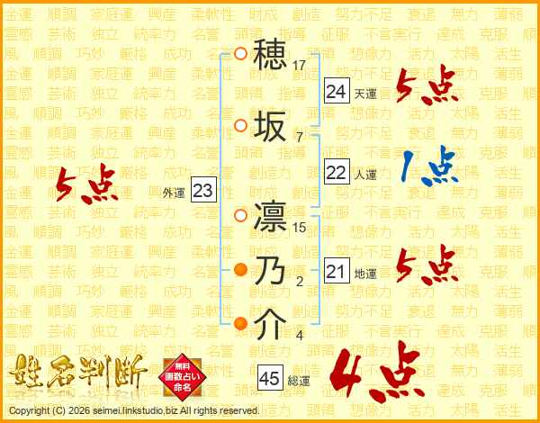 穂(17画)坂(7画) 凛(15画)乃(2画)介(4画)