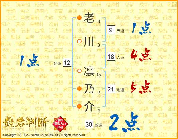 老(6画)川(3画) 凛(15画)乃(2画)介(4画)