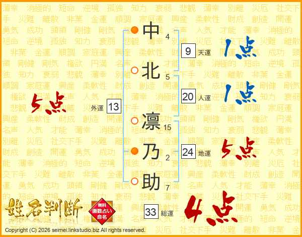 中(4画)北(5画) 凛(15画)乃(2画)助(7画)