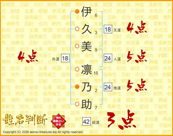 伊(6画)久(3画)美(9画) 凛(15画)乃(2画)助(7画)