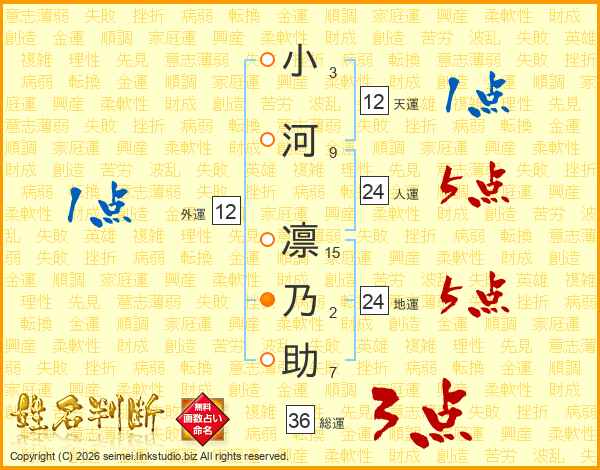 小(3画)河(9画) 凛(15画)乃(2画)助(7画)