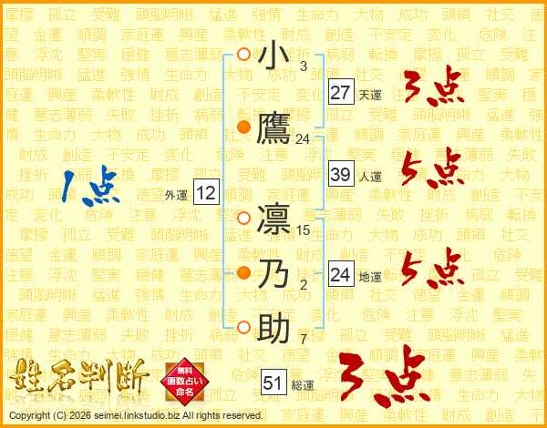 小(3画)鷹(24画) 凛(15画)乃(2画)助(7画)