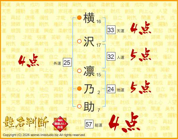 横(16画)沢(17画) 凛(15画)乃(2画)助(7画)