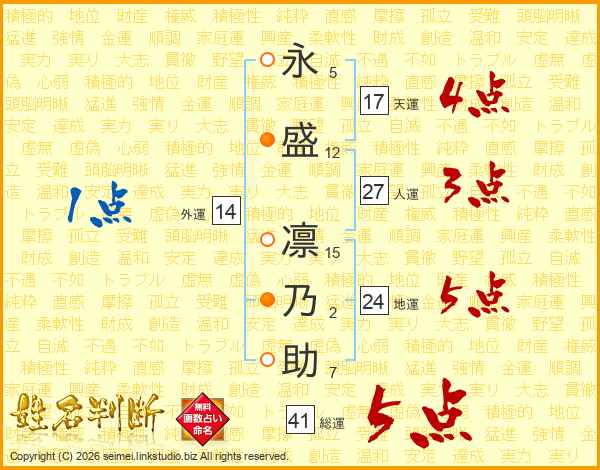 永(5画)盛(12画) 凛(15画)乃(2画)助(7画)
