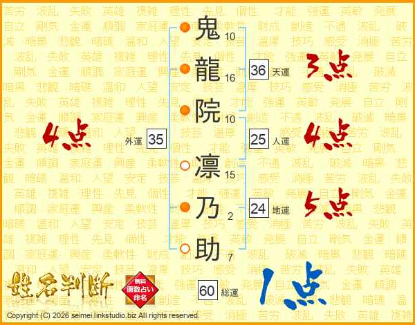 鬼(10画)龍(16画)院(10画) 凛(15画)乃(2画)助(7画)