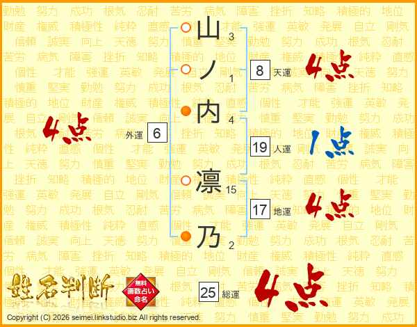 山(3画)ノ(1画)内(4画) 凛(15画)乃(2画)