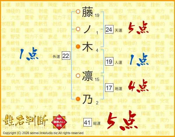 藤(19画)ノ(1画)木(4画) 凛(15画)乃(2画)