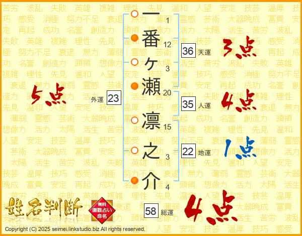 一番ヶ瀬凛之介さんの総運は58画の4点!