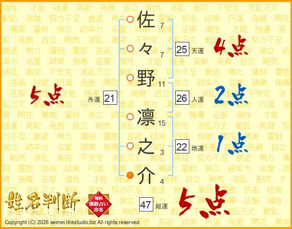 佐(7画)々(7画)野(11画) 凛(15画)之(3画)介(4画)