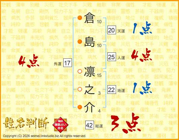 倉(10画)島(10画) 凛(15画)之(3画)介(4画)