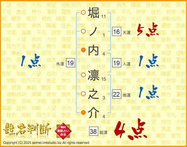 堀(11画)ノ(1画)内(4画) 凛(15画)之(3画)介(4画)