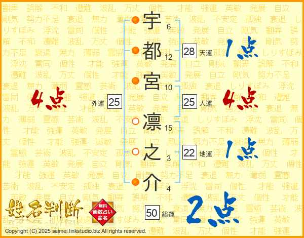 宇(6画)都(12画)宮(10画) 凛(15画)之(3画)介(4画)