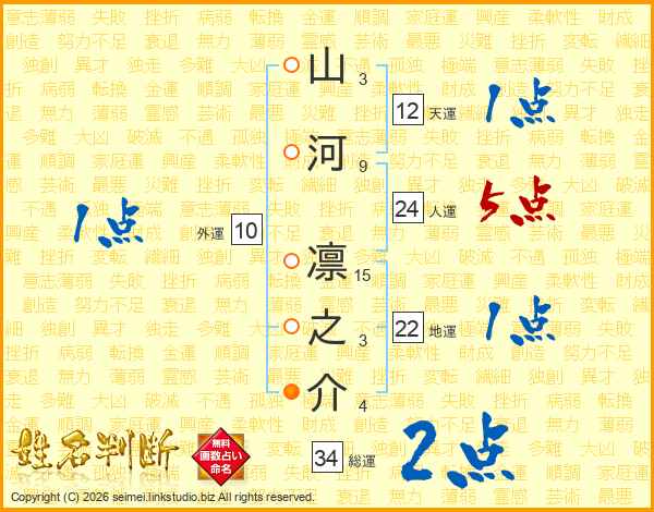 山(3画)河(9画) 凛(15画)之(3画)介(4画)
