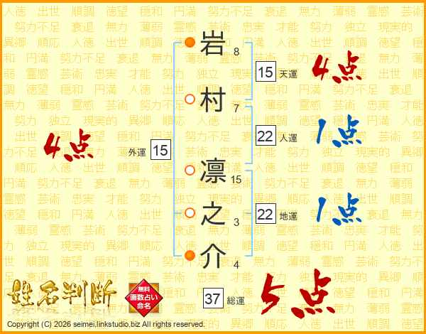 岩(8画)村(7画) 凛(15画)之(3画)介(4画)