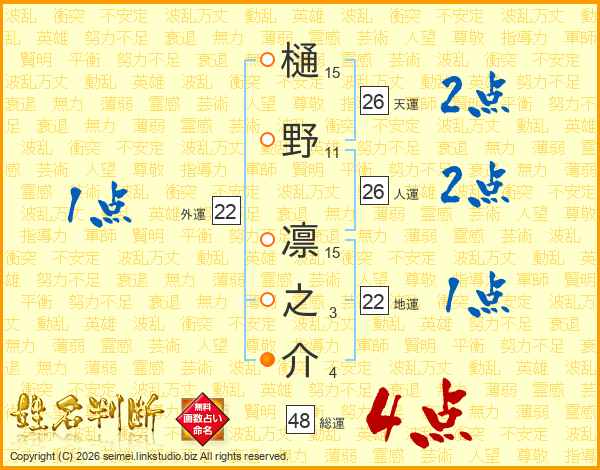 樋(15画)野(11画) 凛(15画)之(3画)介(4画)