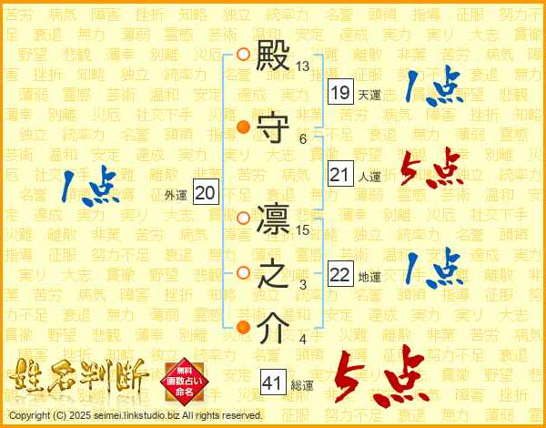 殿守凛之介さんの総運は41画の5点!