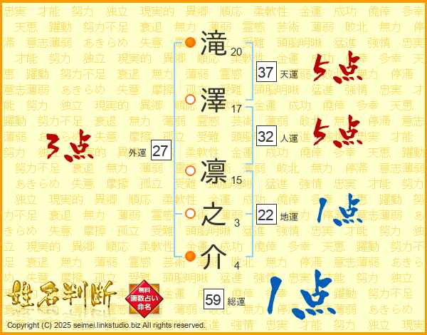 滝(20画)澤(17画) 凛(15画)之(3画)介(4画)
