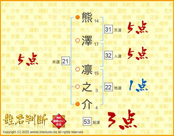 熊(14画)澤(17画) 凛(15画)之(3画)介(4画)