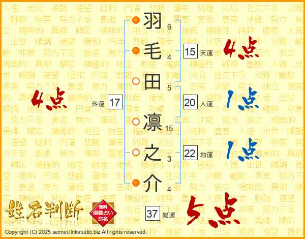 羽(6画)毛(4画)田(5画) 凛(15画)之(3画)介(4画)