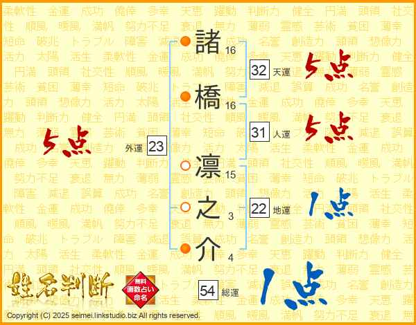 諸(16画)橋(16画) 凛(15画)之(3画)介(4画)