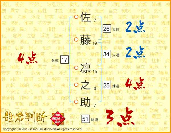 佐(7画)藤(19画) 凛(15画)之(3画)助(7画)
