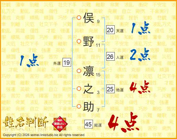俣(9画)野(11画) 凛(15画)之(3画)助(7画)