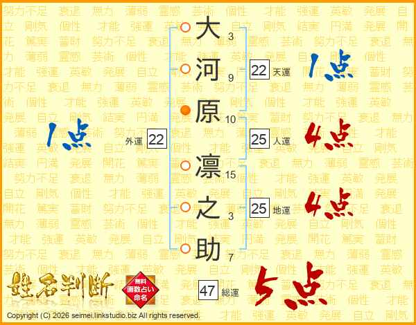 大(3画)河(9画)原(10画) 凛(15画)之(3画)助(7画)