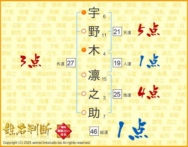 宇野木凛之助さんの地運は25画の4点!
