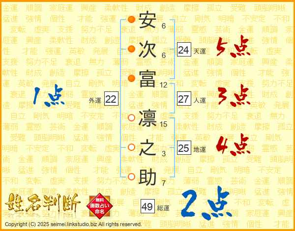 安(6画)次(6画)富(12画) 凛(15画)之(3画)助(7画)