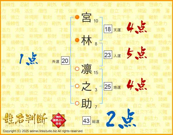 宮(10画)林(8画) 凛(15画)之(3画)助(7画)