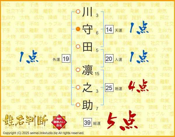 川(3画)守(6画)田(5画) 凛(15画)之(3画)助(7画)