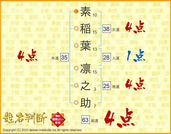 素(10画)稲(15画)葉(13画) 凛(15画)之(3画)助(7画)