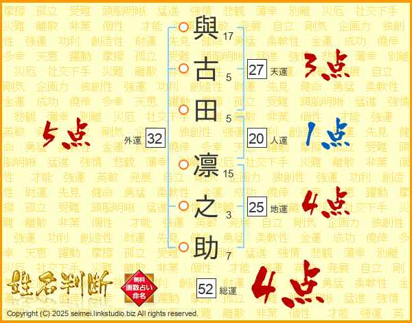 與(17画)古(5画)田(5画) 凛(15画)之(3画)助(7画)
