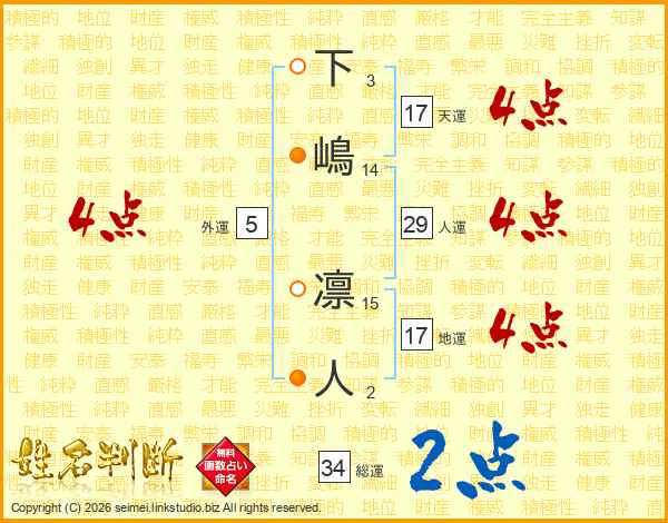 下(3画)嶋(14画) 凛(15画)人(2画)