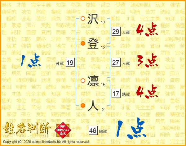 生活面を象徴する運勢です。外部から受ける影響力を表し、結婚運、家庭運や職場、環境への順応性を表します。総運から人運を引いた画数。姓や名が1文字の場合を除く。