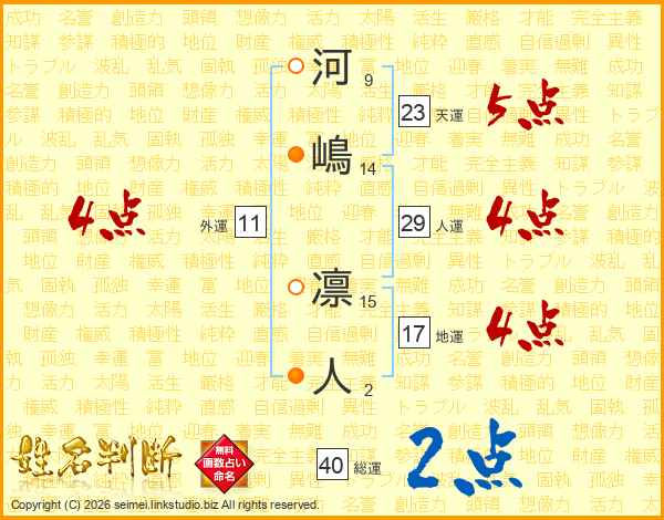 河(9画)嶋(14画) 凛(15画)人(2画)