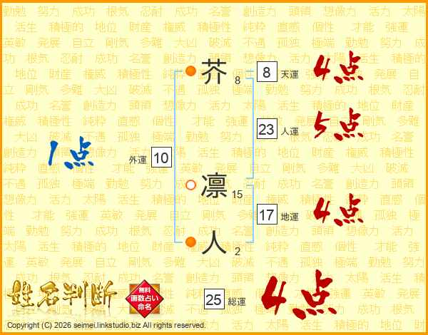 生活面を象徴する運勢です。外部から受ける影響力を表し、結婚運、家庭運や職場、環境への順応性を表します。総運から人運を引いた画数。姓や名が1文字の場合を除く。