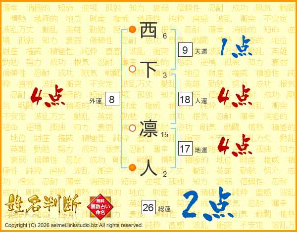 生活面を象徴する運勢です。外部から受ける影響力を表し、結婚運、家庭運や職場、環境への順応性を表します。総運から人運を引いた画数。姓や名が1文字の場合を除く。