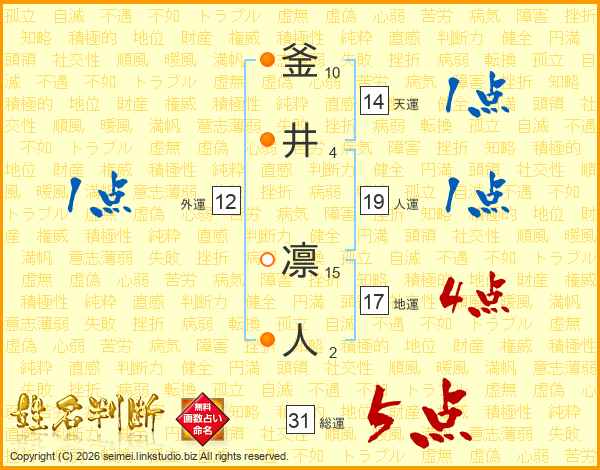 釜井凛人さんの総運は31画の5点!