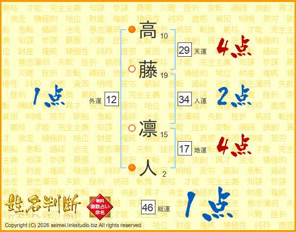 あなたの人生を表す1番重要な運勢です。生涯を通じて影響する総合運となり、主に50歳以降の晩年期に影響を及ぼします。苗字と名前の合計画数。