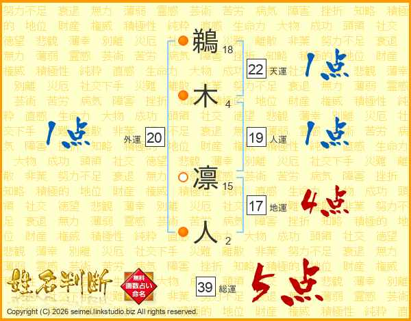 鵜(18画)木(4画) 凛(15画)人(2画)
