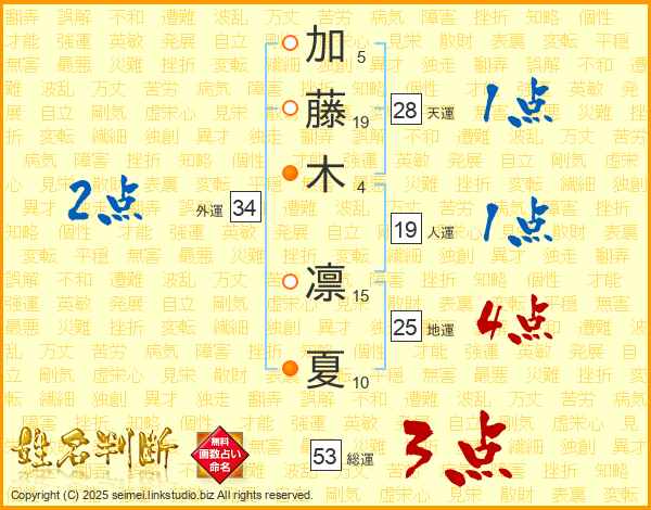 加(5画)藤(19画)木(4画) 凛(15画)夏(10画)