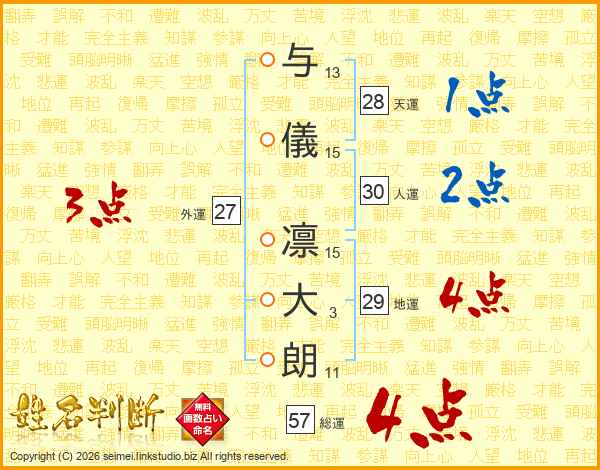 与(13画)儀(15画) 凛(15画)大(3画)朗(11画)
