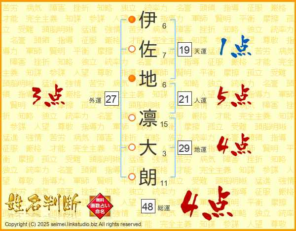 伊(6画)佐(7画)地(6画) 凛(15画)大(3画)朗(11画)