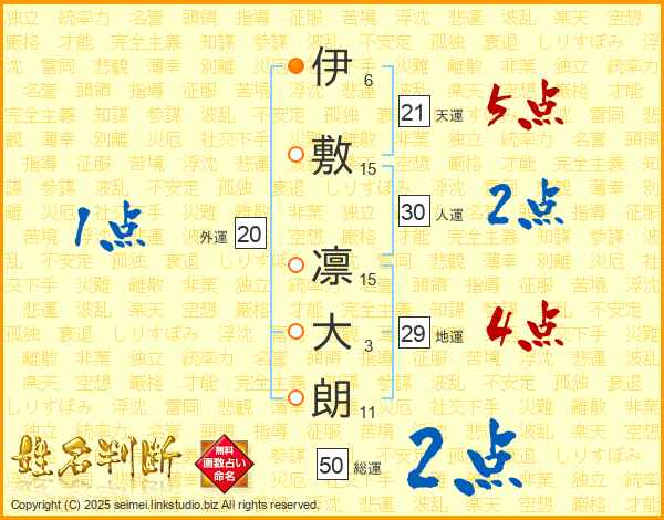 伊(6画)敷(15画) 凛(15画)大(3画)朗(11画)