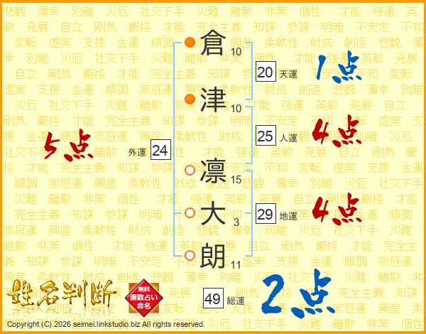 倉(10画)津(10画) 凛(15画)大(3画)朗(11画)
