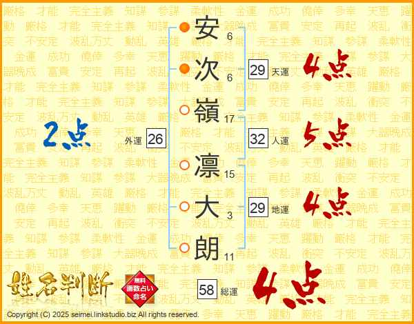 安(6画)次(6画)嶺(17画) 凛(15画)大(3画)朗(11画)