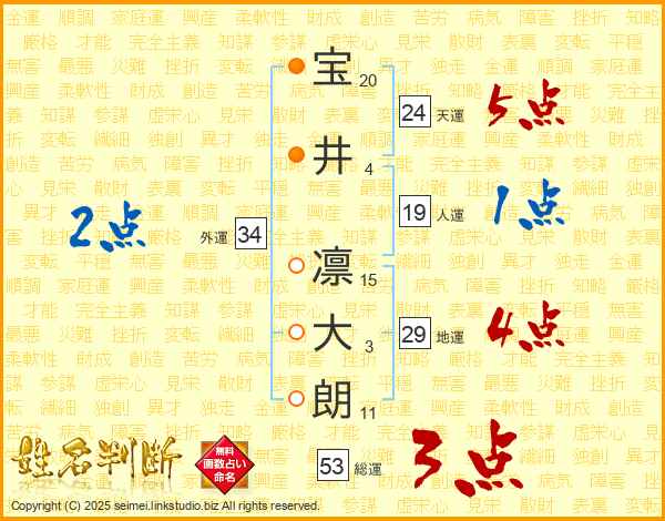 宝(20画)井(4画) 凛(15画)大(3画)朗(11画)