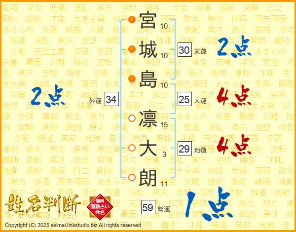 宮(10画)城(10画)島(10画) 凛(15画)大(3画)朗(11画)